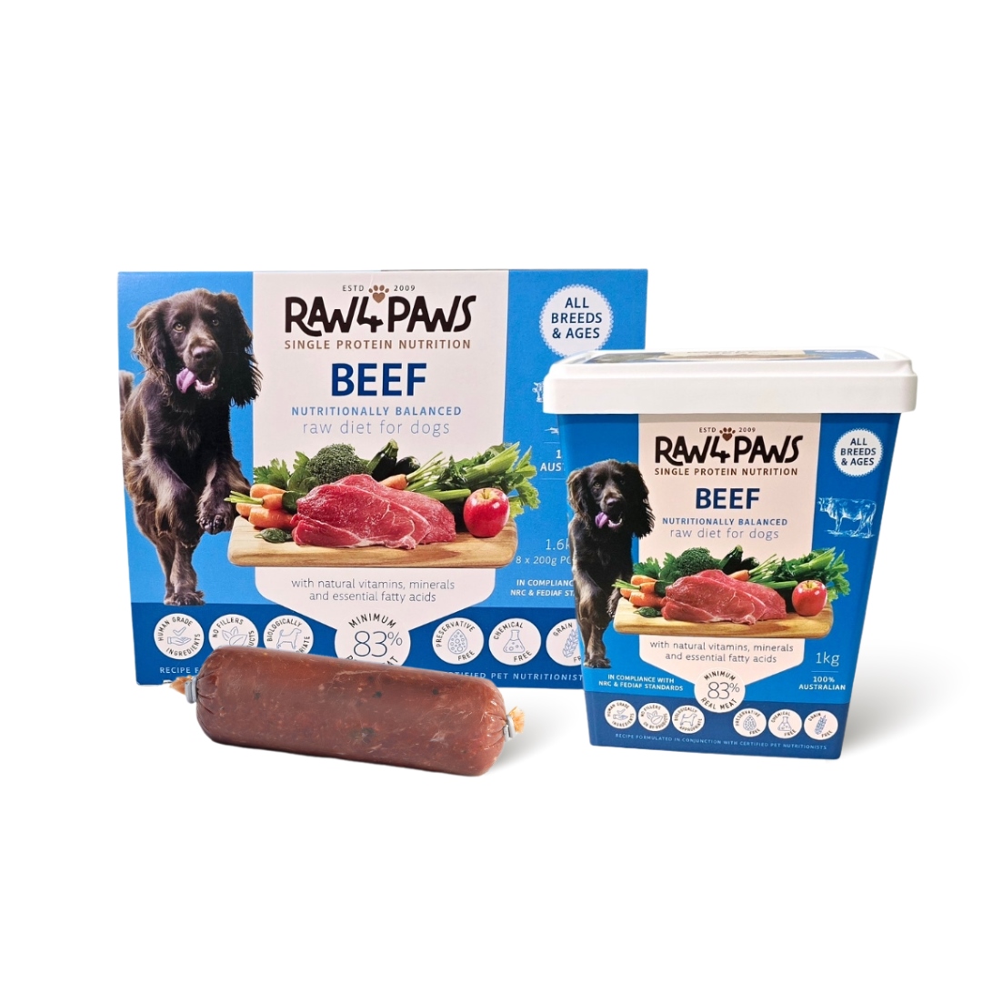 Raw 4 Paws single protein beef features Australian grass-fed beef as the primary ingredient and includes a precisely measured quantity of crisp vegetables and selected fruit, thoroughly mixed and pureed for easy intake of the nutrients plus healthy oils and natural bio-fermented probiotics.