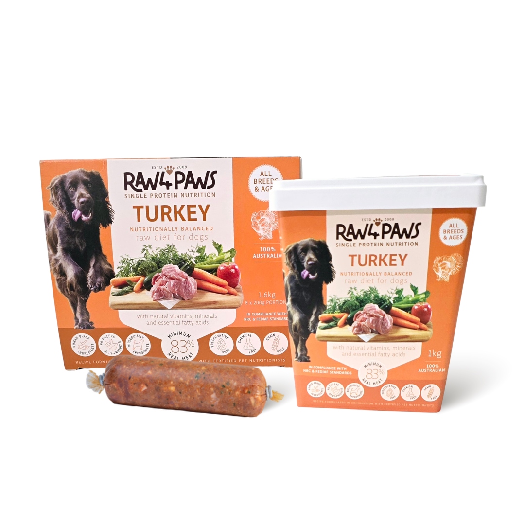 Raw 4 Paws single protein turkey contains Australian, human-grade turkey meat, organs and ground bone, providing a high quality white meat option with essential amino acids, vitamins, healthy oils, natural bio-fermented probiotics and precisely measured quantities of fresh vegetables and fruit. Great option for dogs that can’t tolerate chicken. Does not contain any grain, fillers, chemicals or preservatives. Suitable for all life stages.